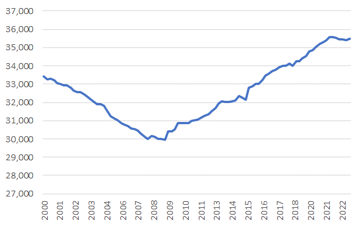 Begin jaren 2000 bereikte de industriële productie in de VS vrijwel haar hoogtepunt en bleef sindsdien grotendeels stabiel. Zoals in Figuur 8.3 te zien is, daalde de industriële productie per inwoner in de VS tijdens deze periode van stagnatie, na acht decennia van gestage groei.