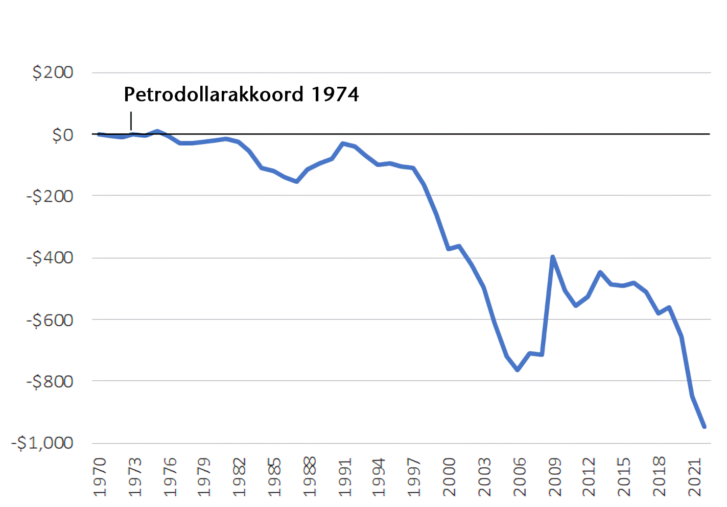 In de jaren ’70, ’80, ’90 en 2000 investeerden handelspartners met grote overschotten die zij in de VS behaalden, vaak hun dollars in Amerikaanse activa, met name staatsobligaties. Dit zorgde ervoor dat de Amerikaanse federale overheid steeds meer geld verschuldigd raakte aan buitenlandse landen, terwijl de dollar sterk bleef ondanks enorme begrotingstekorten.