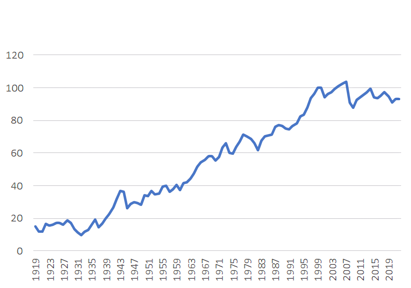 Begin jaren 2000 bereikte de industriële productie in de VS vrijwel haar hoogtepunt en bleef sindsdien grotendeels stabiel. Zoals in Figuur 8.3 te zien is, daalde de industriële productie per inwoner in de VS tijdens deze periode van stagnatie, na acht decennia van gestage groei.