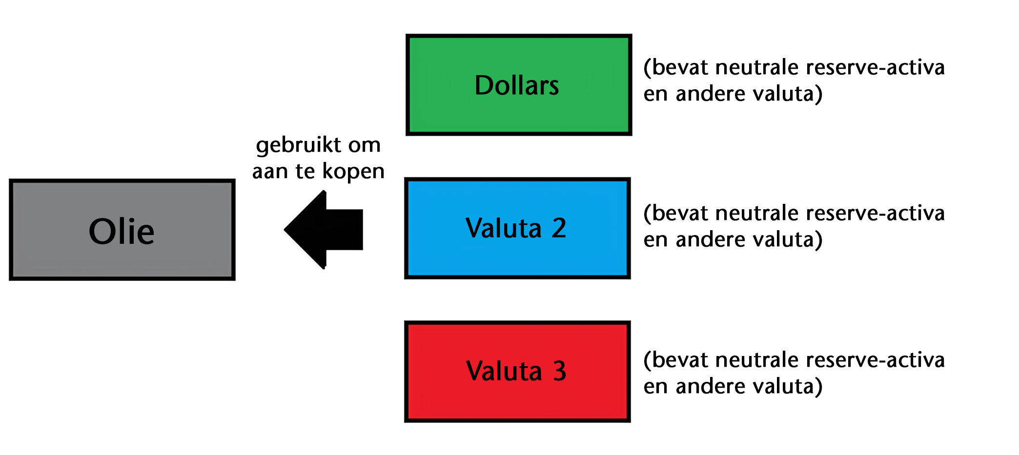 De afgelopen jaren hebben enkele grote valuta, zoals de Chinese yuan, de mogelijkheid gekregen om olie, gas en andere grondstoffen te kopen. De dollar blijft echter de meest gebruikte handelsmunt, al neemt zijn aandeel licht af. Landen diversifiëren geleidelijk hun reserves en betalingssystemen. Figuur 8.4 toont een vereenvoudigd voorbeeld van een multipolair reservemuntsysteem, vergelijkbaar met de diagrammen uit Hoofdstuk 11.